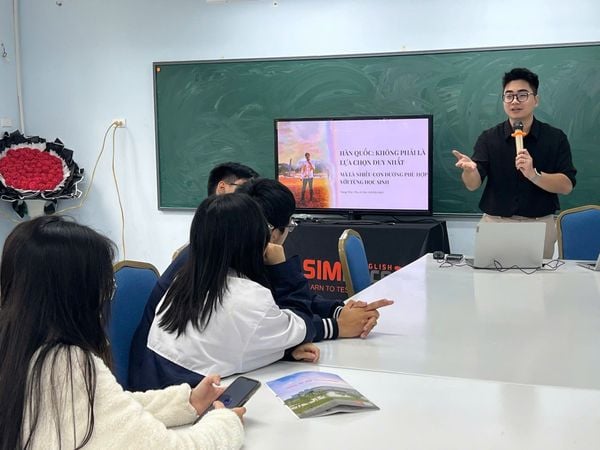Đặc biệt, trong khuôn khổ “Ngày hội định hướng”, học sinh còn được lắng nghe những chia sẻ thực tiễn về du học và hội nhập quốc tế từ các diễn giả của SIMPACE. Nổi bật là phần chia sẻ của anh Ngô Trọng Hiếu – cựu du học sinh Hàn Quốc, hiện là giảng viên tiếng Hàn tại Trường Đại học Kinh doanh và Công nghệ Hà Nội. Với trải nghiệm 5 năm học tập tại Hàn Quốc, anh đã mang đến những góc nhìn chân thực về môi trường giáo dục, văn hóa, đời sống và du lịch tại quốc gia này.